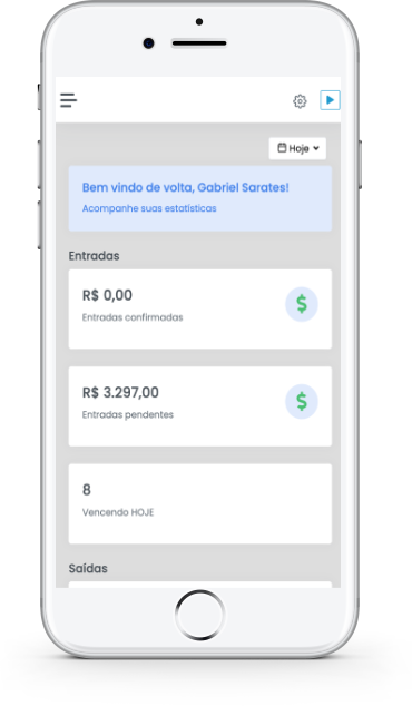 Tela inicial com resumo das entradas e saídas de caixa pendentes
